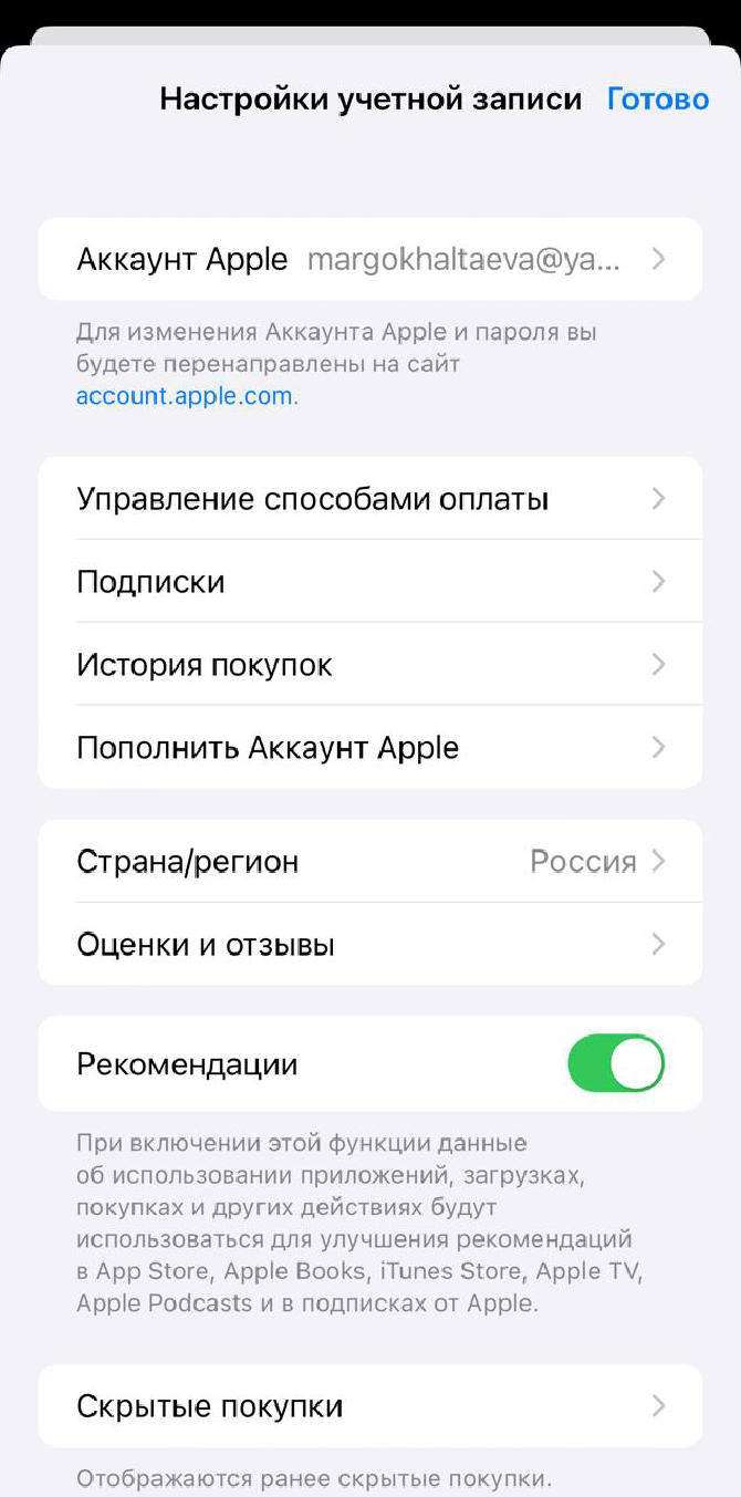 Также перед сменой региона нужно отменить все подписки Apple. Например, AppleFitness+ и AppleMusic. Активные подписки внутри сторонних приложений отменять не нужно.